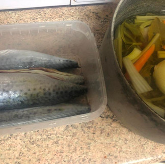 рецепт: Приготовим рассол, в 1 литр воды добавим лук, сельдерей, морковку, стебли пертрушки, закипятить и проварит бульон 20 мин на среднем огне. Добавить все остальные ингредиенты, проварить еще 2-3 минуты. Выключить. Рассол остудить. Залить им почищенную макрель и оставить мариноваться на сутки в холодильнике. После этого рыбу можно жарить на гриле или запекать в духовке.