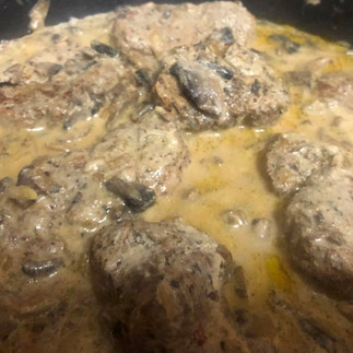 Рецепт: нарезать мясо биточками по 3-4 см длиной, придавить каждое мясо рукой, как лепешку, обмакнуть со всех сторон в специи для мяса и оставить мясо при комнатной температуре на 1 час. Обжарить мясо со всех сторон до румяной корочки, но не до готовности, добавив на сковородку 1 ложку оливкового масла. Вынуть мясо на тарелку, в той же сковородке, которой жарилось мясо, растопить сливочное масло и обжарить быстро лук, добавить порезанные грибы, обжарить овощи пока почти не выкипит вся вода из грибов. Влить бренди, подождеть пока выпарится алкоголь, добавить сметану, вустерский соус, при необходимости разбавить все нежирными сливками до со стояния соуса, выложить в соус уже обжаренные биточки, накрыть крышкой и тушить на медленном огне до готовности мяса( у нас заняло 20 мин) один раз мясо перевернуть.